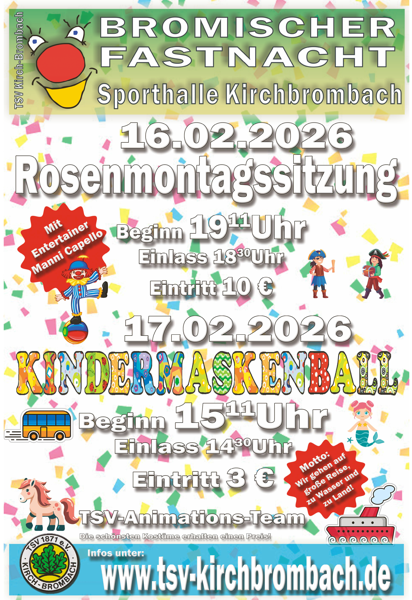 Liebe Närrinnen und Narren, am 16.02.2026 findet in der Sporthalle Kirchbrombach wieder unsere große Rosenmontagssitzung mit vielen tollen Beiträgen zum Lachen, Tanzen, Schunkeln und Feiern, statt. In der bunt geschmückten Halle werden Euch viele Akteure mit tollen Darbietungen überraschen. Über 100 Teilnehmer werden für einen abwechslungsreichen, bunten, lustigen Abend sorgen. Für kleine Speisen ist bestens gesorgt.